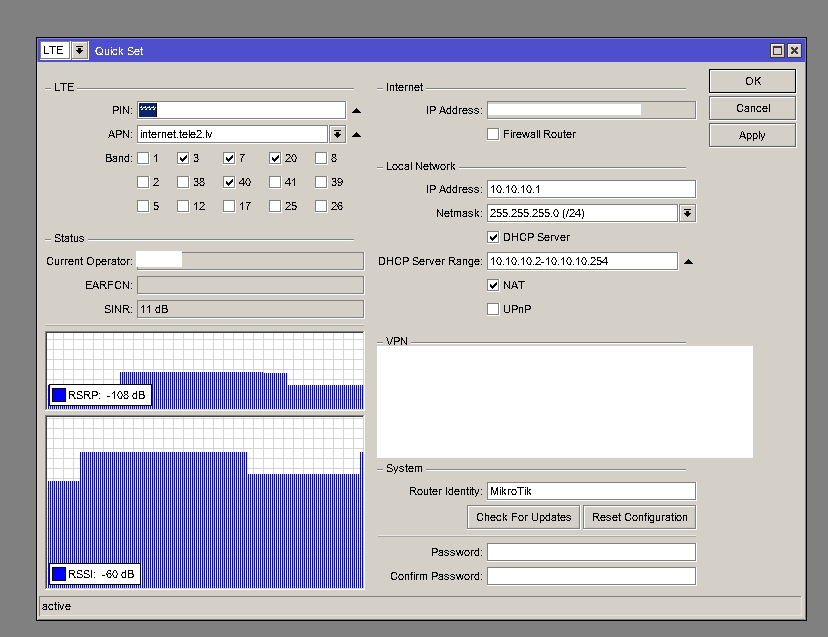 after that, you’re basically done with the LTE device. ( you need to connect to 3,7, 20, 40 bands, at least in Latvia) And… you really don’t need to set anything on the CRS (if you don’t need additional settings for IoT devices) The thing why I bought CRS is because of PoE ports. For this device, if you get the 57V power cord, you can power more or less all Ethernet surveillance cameras you want. (and add something like zoneMinder later). Plus The CRS now powers the LTE device, and I don’t need additional wire to power it. So… basically, you can spend 10 Eur a month ( you need to pay 2.49 per week for ZZ) for unlimited internet.