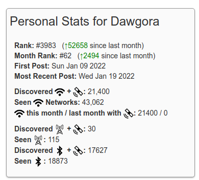 aand this what i got in a week of walking around. I have seen almost 45k networks, and a lot of bluetooth devices. and i got information about their mac addresses, gps location, what kind of wifi it is (as in 2.4, or 5), what channel is it on, what encrpytion does it have, and a lot of other information.