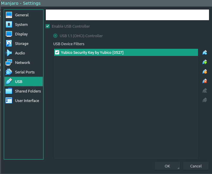 After that, go inside your VM settings > USB, press the \u201cAdd new USB filter\u201d, and select your yubikey there.